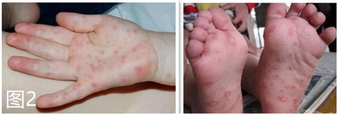 3.皮疹—可能为斑疹,斑丘疹或囊泡。这3种病损可能出现在同一名患者中,皮肤病损通常是无痛性的,但当是柯萨奇病毒A6(CV-A6)引起时,病损可能是痛性的。典型的皮疹通常累及双手(手指背侧、指间、手掌),双足(趾背侧、足外侧缘、足底、足跟),臀部,腿部(上部大腿)及手臂(图2、图3)。