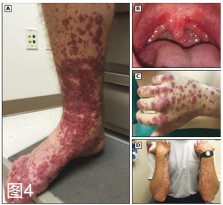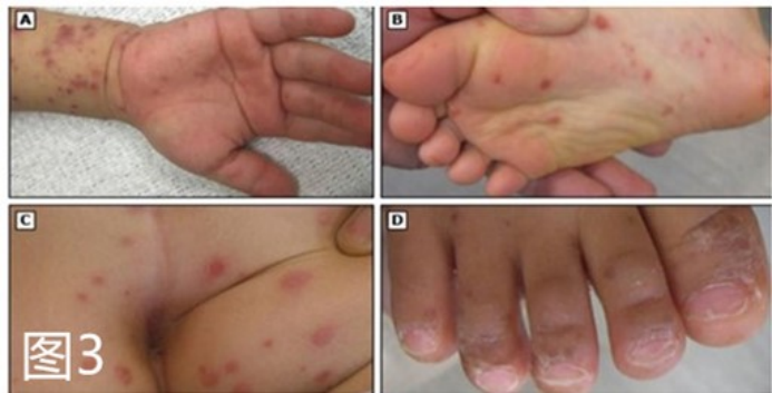 但没有宝宝是按照教科书生病的,皮疹除出现在上述典型部位外,还可能出现在身体的其他部位。和新冠病毒一样,引起手足口的肠道病毒也在不断的变化之中,从早期引起手足口小水泡的CV-A16,到后来的暗红色小点点,红晕(EV-A71),再到近10余年有增多趋势可引起全身皮肤广泛受累,大量水泡,大炮,糜烂,最后结痂的CV-A6(图4)。
