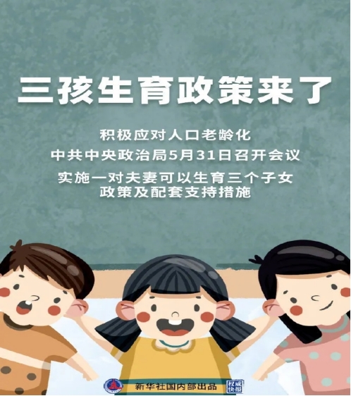中共中央政治局5月31日召开会议,会议指出,进一步优化生育政策,实施一对夫妻可以生育三个子女政策及配套支持措施,有利于改善我国人口结构、落实积极应对人口老龄化国家战略、保持我国人力资源禀赋优势。