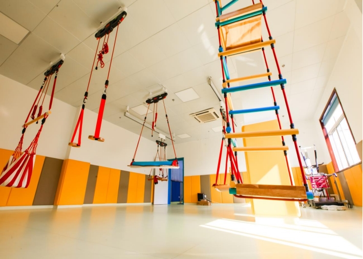 医院儿童康复中心将根据每个孩子功能水平的不同设定个性化的康复训练方案,该疗法集神经发育疗法、感觉统合训练、引导式教育于一体,使孩子们的玩耍中完成肌张力的缓解、肌力的增强、平衡协调性的提高。