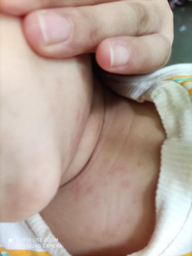 发热3~5天后,体温开始下降,多数情况下,热退后就开始出疹子,少数在发热的同时出疹以及热退后几天出疹。皮疹多为红色斑丘疹,散在,直径2~5毫米不等,压之褪色,很少融合。皮疹通常先发生于面颈部及躯干,以后渐渐蔓延到四肢近端。多数持续1~2天,也有长至5天,皮疹消退,疹退后不留任何痕迹,没有脱屑和色素沉着。皮疹无需特殊处理,可自行消退。