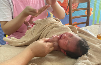 按摩过程中有的宝宝会出现饿了或者拉臭臭了,就会出现一些哭闹的现象!如果拉臭臭了我们都会及时给宝宝清洗,饿了会给宝宝暂时的吸安抚奶嘴或者宝宝自己的小手去安抚宝宝。