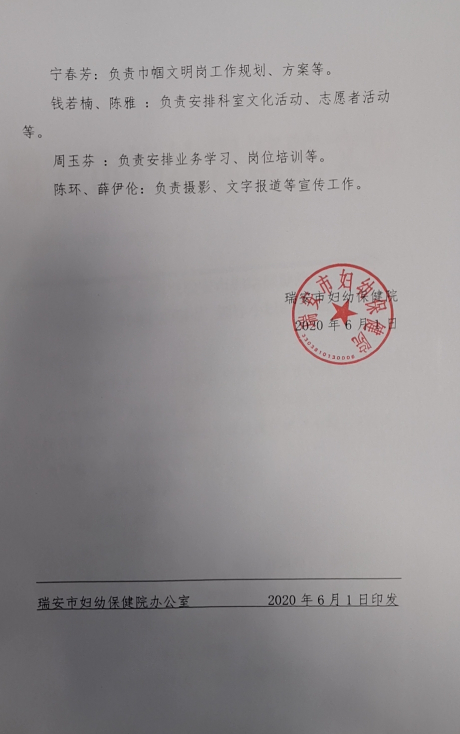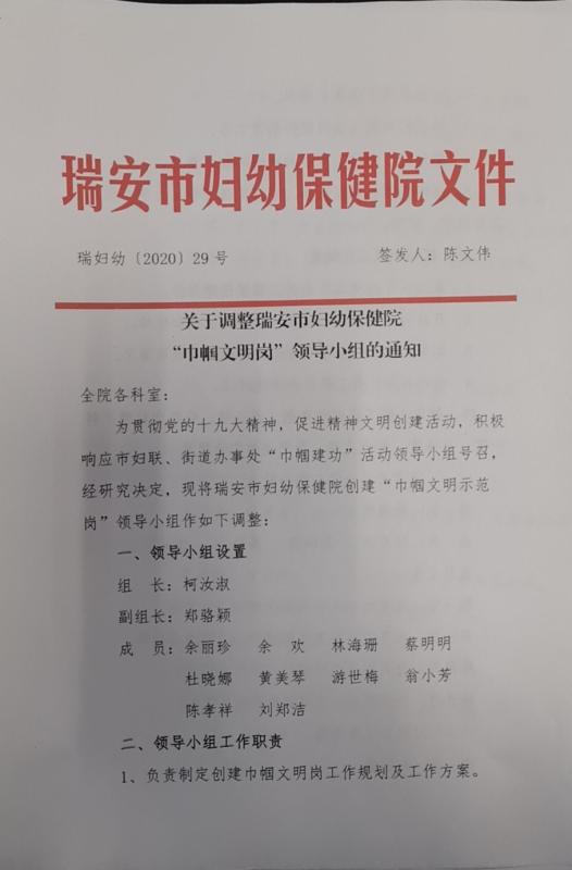 瑞妇幼〔2020〕29号关于调整创建瑞安市妇幼保健院“巾帼文明岗”领导小组的通知
